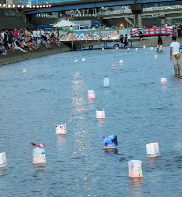 夜の部では、市内幼稚園、保育園児、そして市民の皆様による手作りの「灯ろう流し」が行われ、約500個の灯ろうにに夢や希望を乗せて加茂川に流しました。