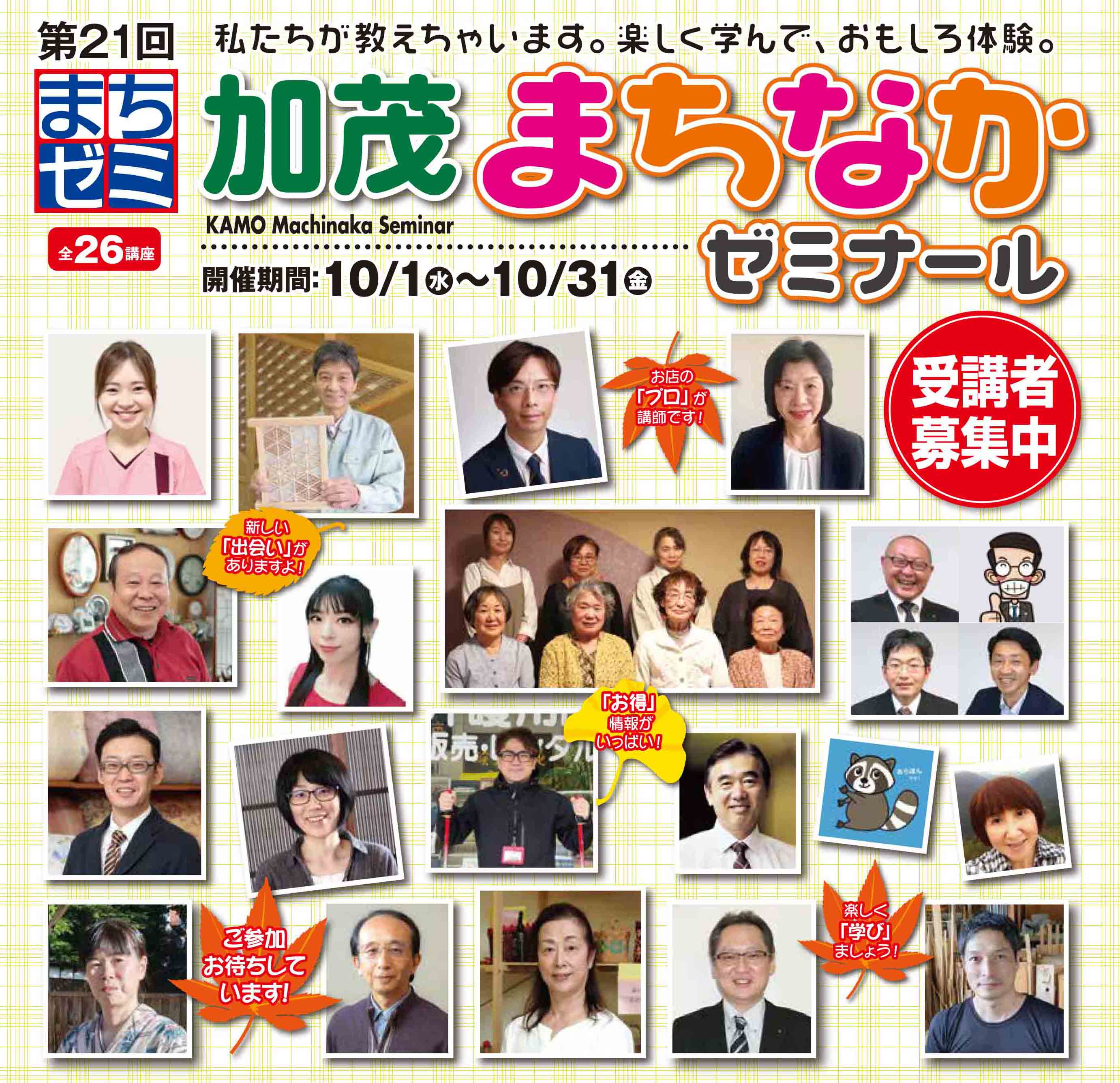 10月1日(水)〜31日(金)の1ヶ月間、『加茂まちなかゼミナール』を開催いたします。お店の人が講師となって専門店ならではの専門知識や情報、プロのコツを無料で教える「まちなかゼミナール(通称『まちゼミ』)」では、今回もバラエティーに富んだ全26講座がそろっています。参加費は無料(材料費は自己負担)で市外の方も参加できますので、ぜひチラシをご覧のうえ、気になる講座にご参加ください。